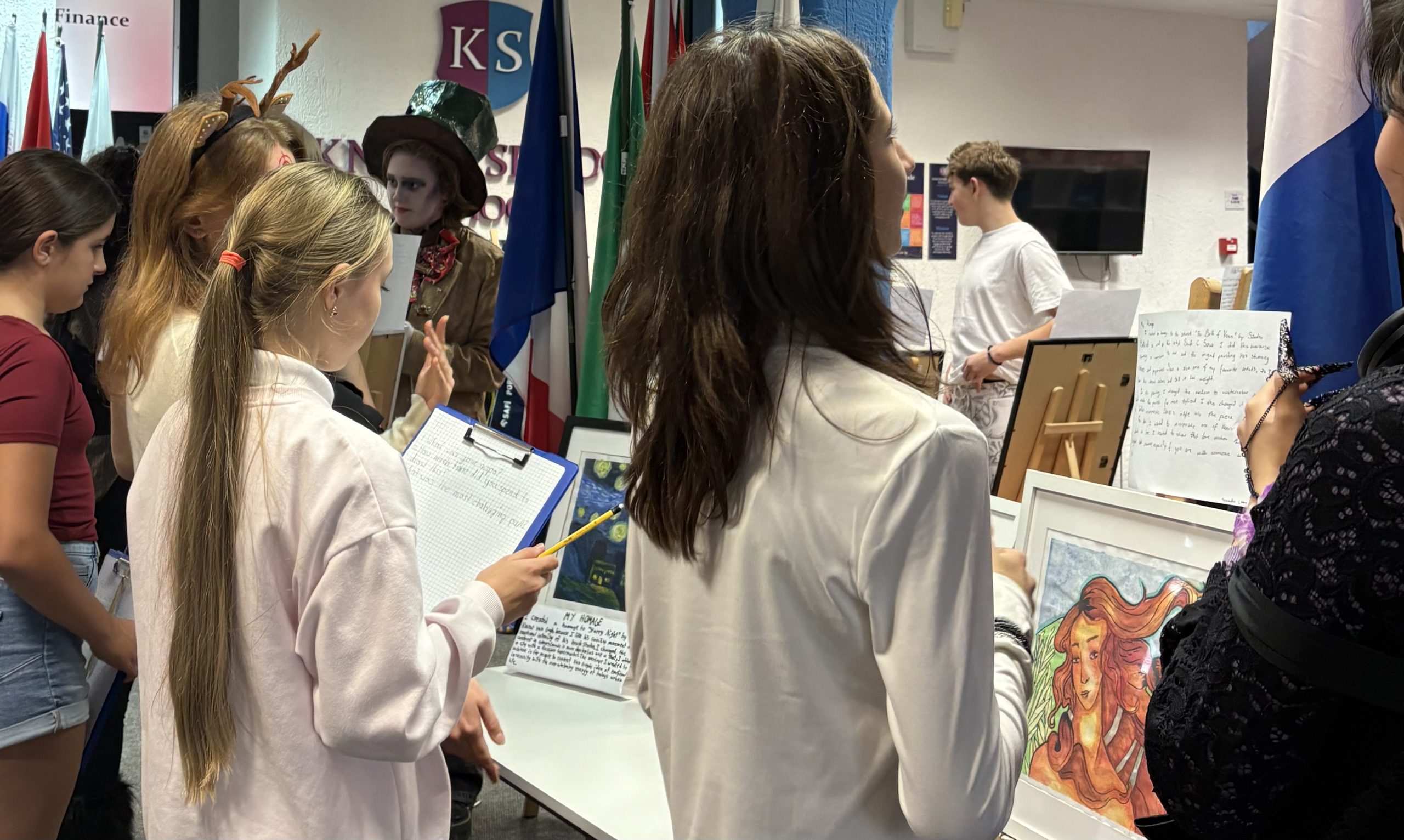 The atmosphere was very positive and full of excitement. Everyone enjoyed seeing how much effort and passion went into each artwork. The exhibition showed how art can bring people together and how every student can express themselves in a different way.