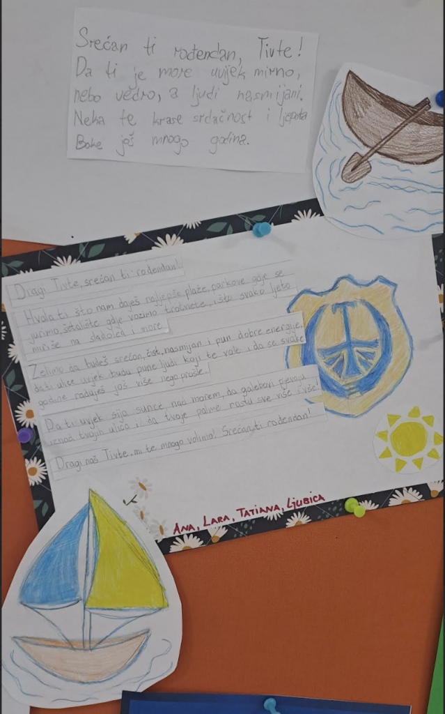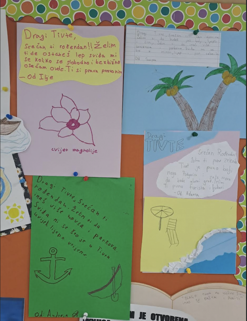 Students from Montenegrin B prepared birthday greetings for the city, expressing gratitude and well-wishes for Tivat’s special day. Their messages are simple, sincere, and filled with genuine affection for the city they consider their home.