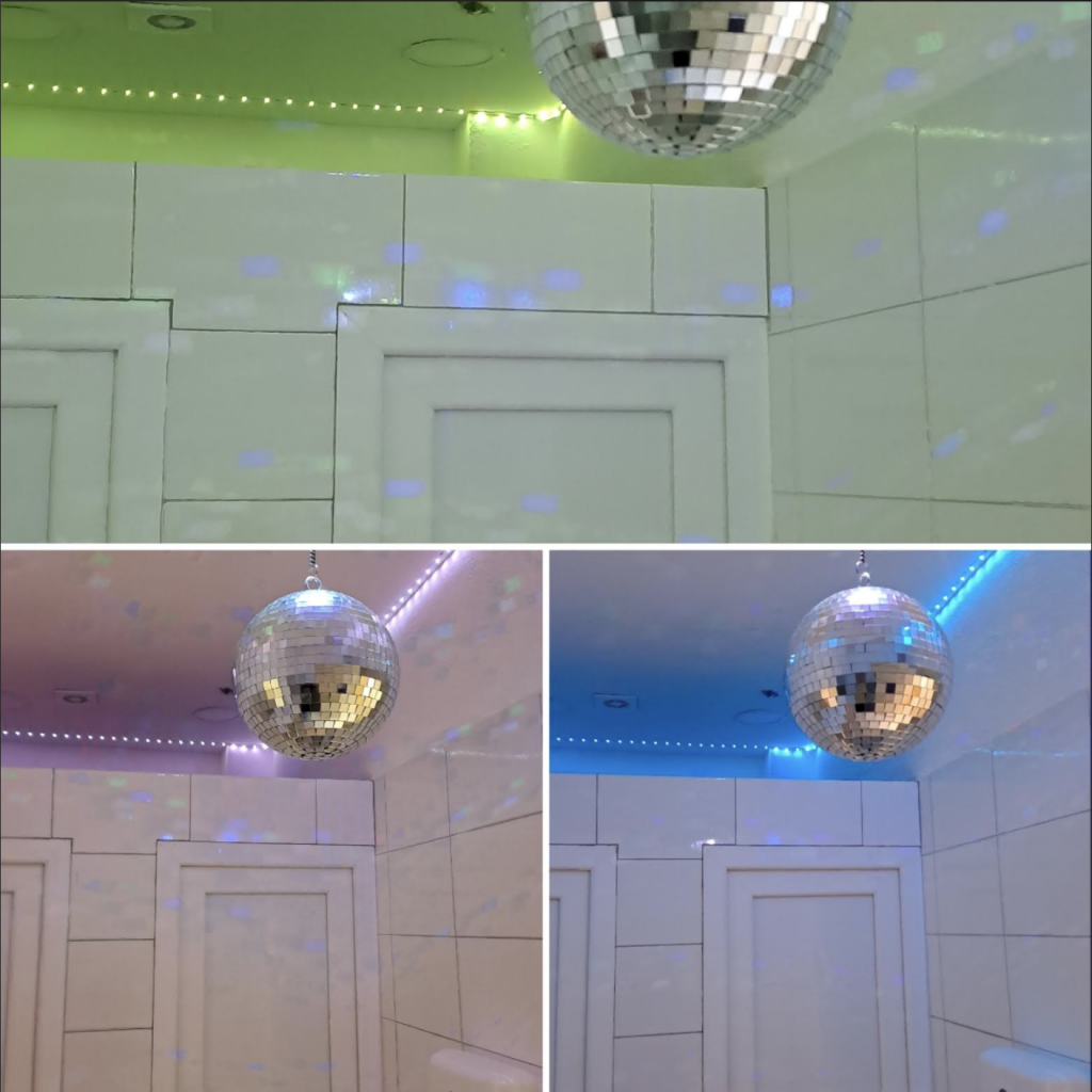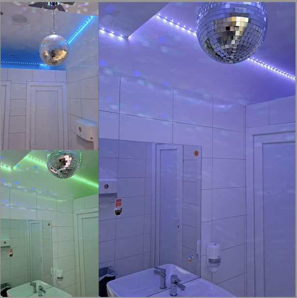 Alex, Nick and Lucian brought in and installed glowing LED lights — the small, practical ones usually meant for kitchen cabinets — but this time in vibrant purple, green, and blue shades. They even hung up a real disco ball, which now slowly rotates and scatters reflections across the walls as if inviting you to dance… or at least wash your hands with a bit more enthusiasm.